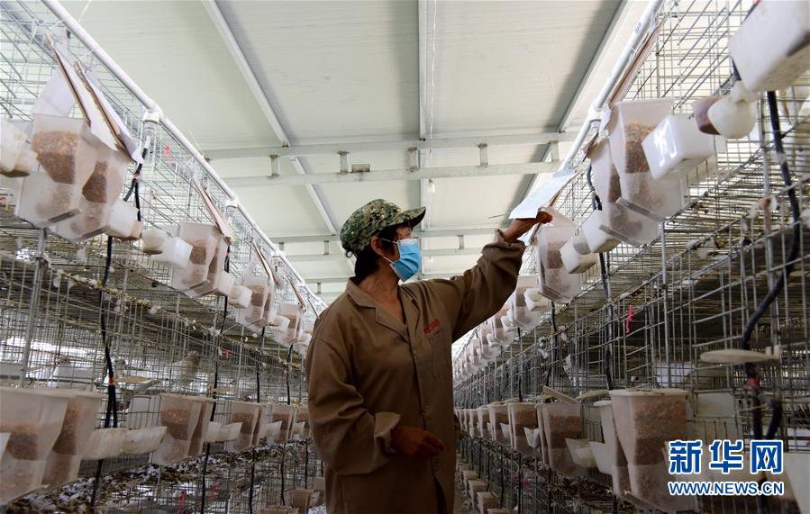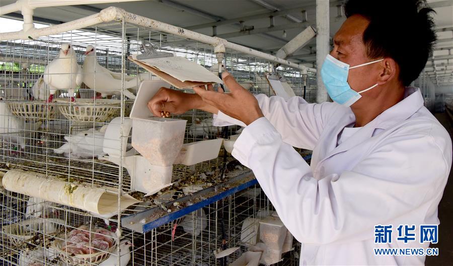 5月21日,饲养人员在鸽舍工作。 河南省确山县普会寺镇依靠产业扶贫发展肉鸽规模养殖项目。目前该项目通过土地流转入股、就业吸纳、代养代管和收益分红模式带动脱贫140户,使农户增收致富。 新华社记者朱祥摄