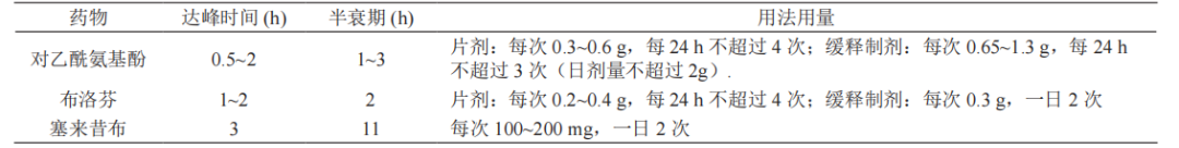 常见非甾体消炎镇痛药和对乙酰氨基酚的药代动力学参数和用法用量