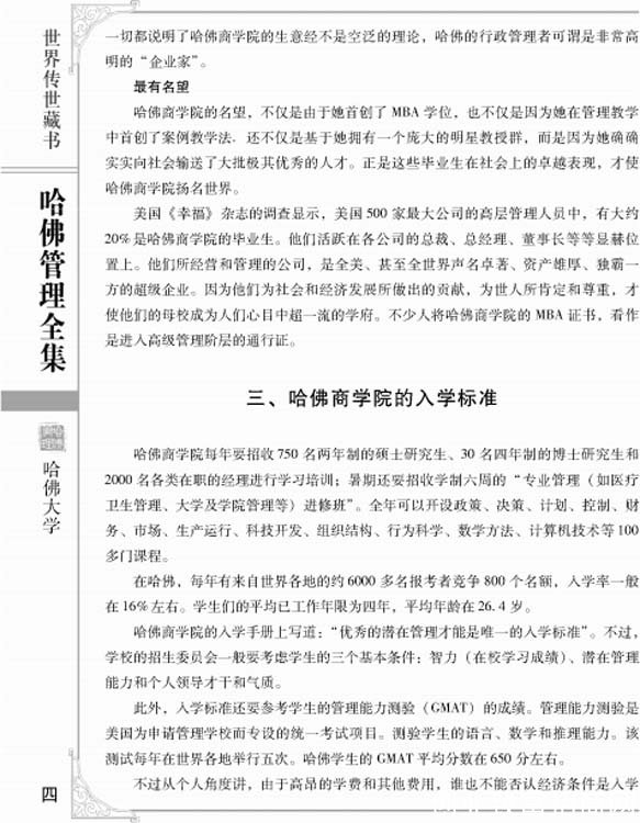 《哈佛管理全集》汲取了哈佛商学院关于怎么教和学什么的精髓,融汇哈佛商学院MBA教育九项主修课程,并借鉴大量哈佛管理经典案例,以期详尽、真实地反映哈佛商学院的案例教学方法,为工商管理精英提供制定各种决策方案的工具和框架,培训和强化各级经理,尤其是高层经理的管理技能和技巧。《哈佛管理全集》的主要内容安排如下: