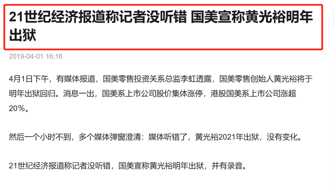 不过面对该消息的公开发酵,2019年4月1日下午,李虹则赶紧现身辟谣称《21世纪经济报道》的消息不实,还表示黄光裕2020年出狱系媒体听错,并表示“黄光裕正常刑期到2021年2月16日,没有变化”。