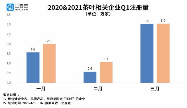 企查查数据显示,2021年第一季度,茶叶相关企业一共新注册了6.1万家,同比上涨了17.3%。从各月注册量来看,三月是茶企注册的高峰期,今年三月份新注册量为3.0万家,与去年同期持平。