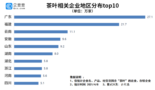 从地区分布来看,企查查数据显示,目前我国茶叶相关企业数量最多的省份为广东,数量达27.1万家,福建省以21.7万家紧随其后,云南、安徽、山东分别以11.1万家、9.6万家、9.2万家排名3-5位。