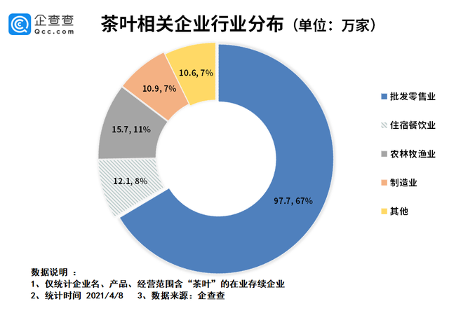 如今,茶叶早已走出了单纯农作物的范畴,日益形成一个横贯一、二、三产业的庞大产业链。企查查数据显示,目前茶叶相关企业多集中于批发和零售业,占比约67%,处于第一产业的农林牧渔业则占比11%,随着科技手段的提升,茶叶消费市场正在进入更广泛的领域。